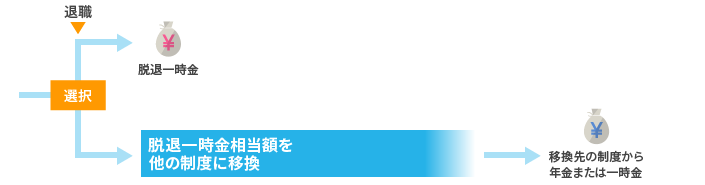 - 中途脱退者は、退職時に脱退一時金をうけとらずに、転職先の企業年金や企業年金連合会等に脱退一時金相当額を持ち運び(移換)、将来の年金受給に結びつけることもできます。これを「ポータビリティ制度」といいます。